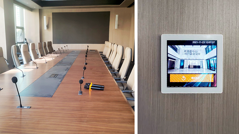 这是一间讨论型会议室,适用于会议集中讨论,4寸嵌墙式智能触摸屏,结合专用PR580时序器,做到了一键式控制,人性化操作,简单易用。搭配无线手持话筒,会议/演唱K歌一键切换。