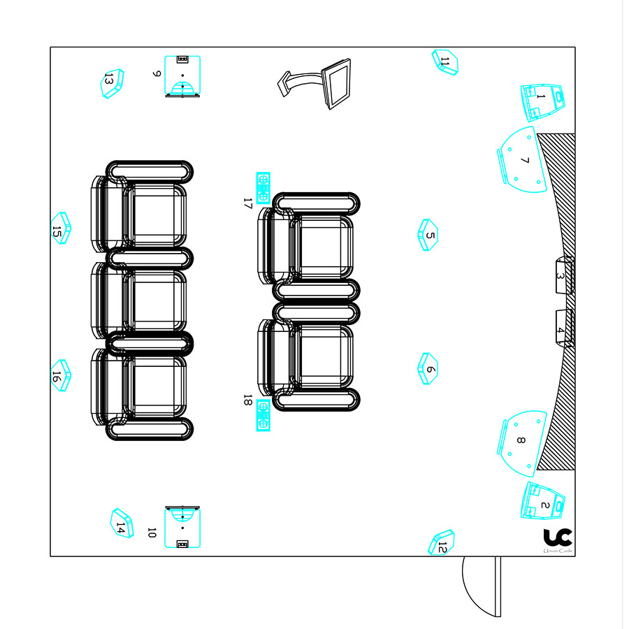 浙江某业主,新潮时尚,且酷爱电影,尤其喜好好莱坞大片电影,但是每次奔波影院,让其倍感疲乏。一直都想在家里置办一套家庭影院,但是传统的影院根本体会不到,那种声音环绕的感觉,和电影院相比,那种氛围差了很多。尤其对于他这种痴迷电影的人更是无法忍受的弊端!偶然的机会,他了解到了我们公司,而我们的目标就是“把好莱坞电影搬回家”。这引起了他的极大兴趣,于是抽空来到了我们公司,体验了一番。挑剔的他最终也对我们的系统点头称赞。并表示,这就是他想要的效果。我们根据他的需求和实际面积,制定出了下面这套方案: